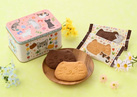 「みけねこのケーキ」は、丸まって寝ている三毛猫が愛くるしいプチデコレーション。「小ねこサブレ」は、おなじみのココア味に新たにバター味が加わり、さらにレトロチックなデザインの缶入りで登場!