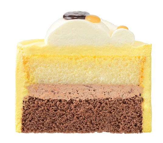 特長:2月22日の「ねこの日」に合わせて、三毛猫が丸まって寝ている姿をイメージしたひとりじめサイズのプチデコレーション。三毛猫の柄のように、プレーン&ココアの白黒2色のスポンジでチョコチップ入りキャラメルチョコクリームをサンド。上面や猫の姿は、やさしい味わいのカスタード風味クリームで仕上げました。