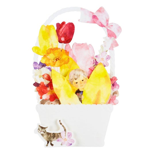 花かごの形の立てて飾れるカードです。かごいっぱいのチューリップと、こちらを見つめる男の子が印象的。かごの模様はエンボス加工(凸状に盛り上げる加工)で表現されています。※記載価格はすべて税込みです。