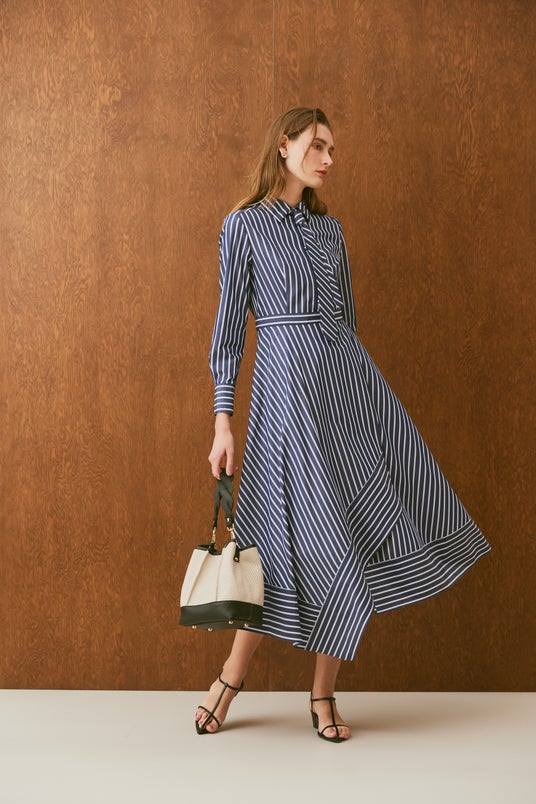 Online limited color:Navyアシンメトリーのラップデザインが1枚で着映えするシャツワンピース。取り外し可能なネクタイ付きで、マニッシュな印象に。オフィシャルサイト限定カラーはネイビーベースのストライプで適度なハリ感と滑らかな表面感が特徴の生地を使用。シンプルでありながらも様々なスタイルに合わせることができるアイテムです。