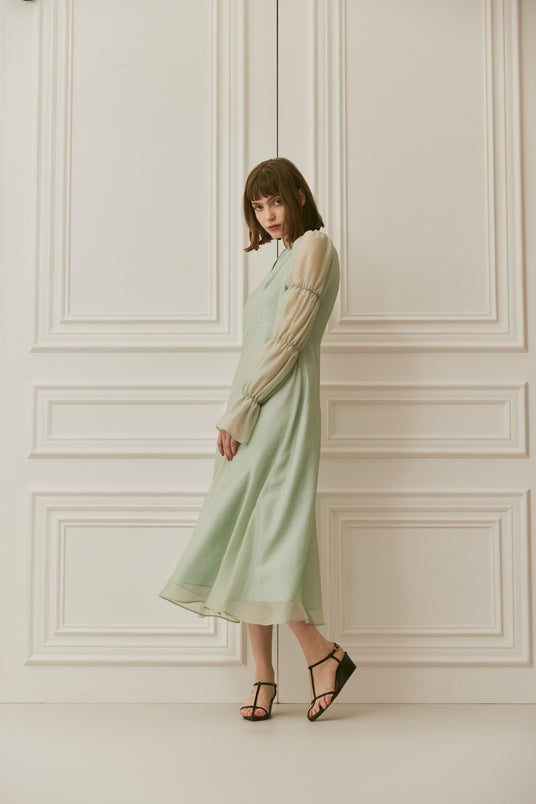 Online limited Color:Greenトレンドのシアー素材を使用したドレスは、あえてシワ感を出したワッシャー加工を施したニュアンスのある表情が新鮮。オフィシャルサイト限定カラーは春らしく洗練された印象のグリーン。女性らしさを引き立てるエレガントで華やかなアイテムです。