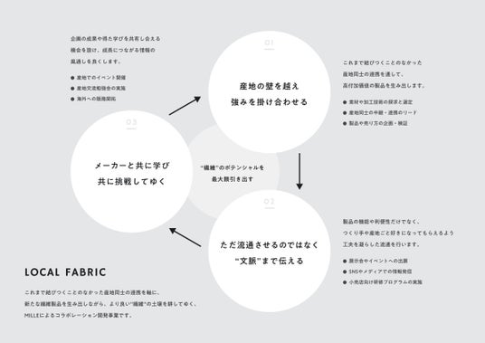 繊維のポテンシャルを最大限引き出すことをミッションとし、これまで結びつくことのなかった産地同士の技術連係を軸に、新たな繊維製品を生み出しながら、より良い繊維の土壌を耕していく、MILLEによる産地共創事業です。