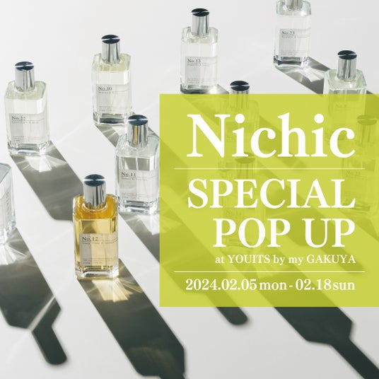 < Nichic x YOUITSの期間限定イベント開催>名古屋の栄で展開する、”まだここにしかないコスメ”を多く取り扱うセレクトショップ「YOUITS」内にて、期間限定のNichic販売イベントを開催致します。オフライン店舗では最多となる17種の香りを体験することができる上、イベント特別価格を最大20%オフでお買い求め頂けます。YOUITSのスタッフが香りの好みなどを丁寧にヒアリングし、あなたにピッタリな香りを提案します。バレンタインギフトをお探しの方、誕生日ギフトをお探しの方も、YOUITSでしか体験できないNichicの香りに出会うチャンスです。