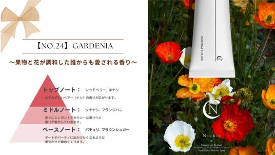 スプレータイプと異なりアルコールがなく揮発しないため、非常に香りが穏やか。持続時間の長さを保てるよう研究を重ね、生み出されたNichic PAFURM SOLIDE。手首や首元に練りこむように塗っていただくと、約4時間柔らかい穏やかな香りが身体になじみます。香りをひろげず、ほんのりとした香りが楽しみにたい時におススメです。良質なオーガニックであるからこそ、長続きする上質なほのかな香りをご体感ください。