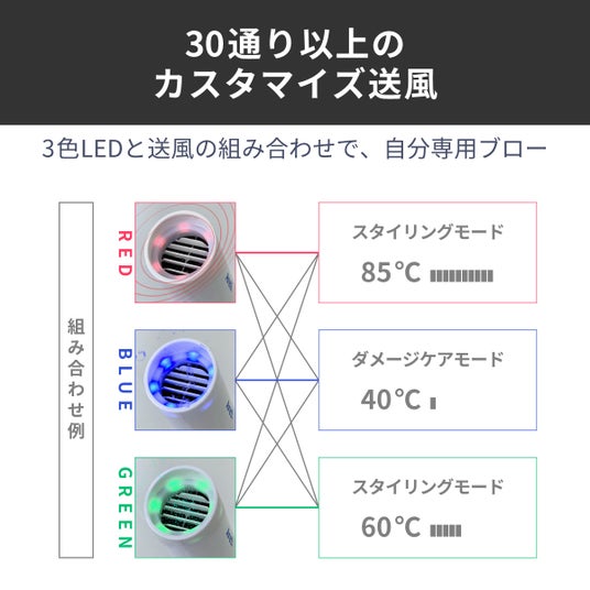 3色のLEDライトを搭載し、30通り以上のカスタマイズ送風も可能だから、とにかくスピーディに乾かしたいとき、丁寧にブローしたいとき、子どもの繊細な髪を乾かしたいときにもおすすめです。