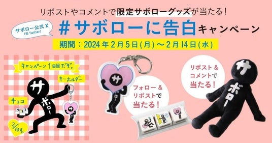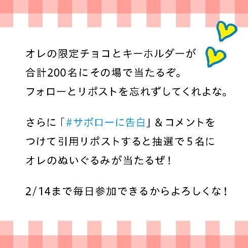 期間中、サボロー公式Xをフォロー&キャンペーン投稿をリポストしていただくと、合計200名さまにバレンタイン限定「サボローチョコレート&アクリルキーホルダー」がその場で当たります。さらに、引用リポスト& #サボローに告白 をつけてコメントしていただいた方の中から抽選で5名さまに「サボローぬいぐるみ」が当たるWキャンペーンを実施。「告白」にちなんだ内容であればなんでもOK!思い思いの言葉で、サボローに告白したいことをコメントしてください。