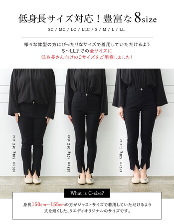 ・通常のSからXLサイズに加え、身長155cm以下の方が綺麗に穿けるCサイズも。