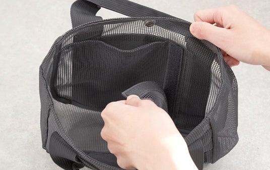中に水が溜まらないよう、本体はメッシュ素材を使用。それでいて中身が透けて見えにくいダークカラーで仕上げています。