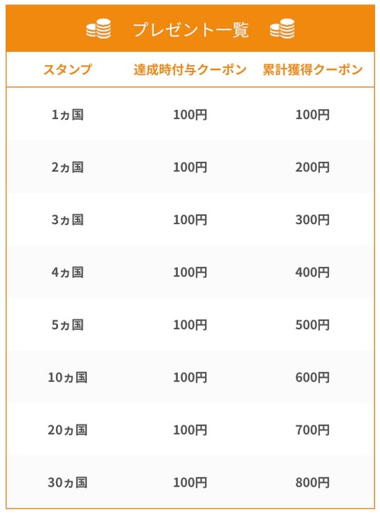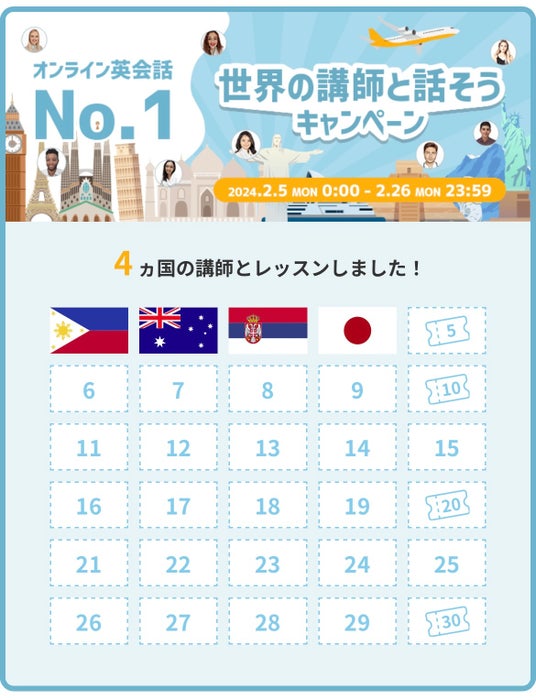 レッスンを5分以上受講すると、受講した講師の該当国のスタンプがスタンプラリーに押されます。獲得スタンプ数に応じて、もれなくクーポンをプレゼントいたします!1ヵ国からクーポンを獲得できますので、この機会にぜひ世界中の講師との英会話レッスンをお楽しみください。