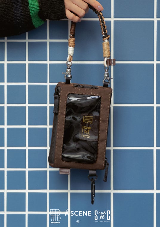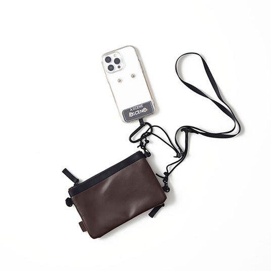 A SCENEオリジナルのスマホポーチ一面をコーヒーレザーで仕上げました。