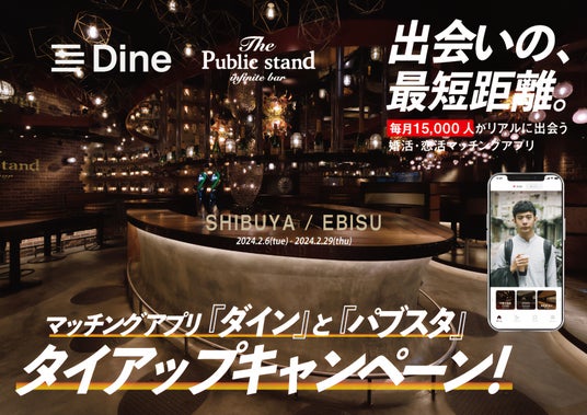 株式会社Mrk&Co(本社:東京都渋谷区、代表取締役社長:上條 景介)は運営するマッチングアプリ『Dine』(以下:ダイン)において、2024年2月6日(火)~2024年2月29日(木)の間、株式会社セクションエイト(本社:東京都渋谷区、代表取締役社長:安田 隆之、以下セクションエイト)が運営するアミューズメントBAR『The Public stand』(以下:パブスタ)とコラボレーションすることをお知らせいたします。