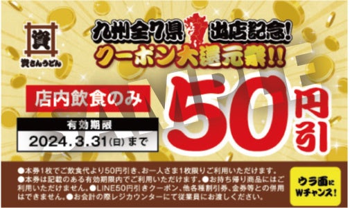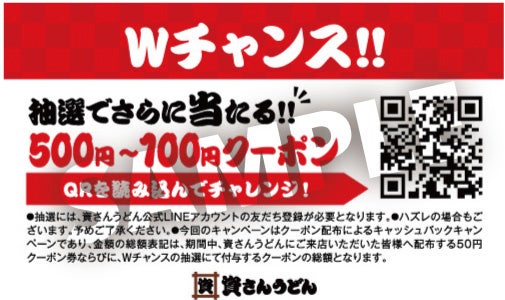 ●今回のキャンペーンはクーポン配布によるキャッシュバックキャンペーンであり、金額の総額表記は、期間中、資さんうどんにご来店いただいた皆様へ配布する50円クーポン券ならびに、Wチャンスの抽選にて付与するクーポンの総額となります。