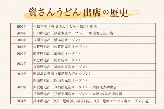 その後、山口県、福岡県内、佐賀県、熊本県、大分県、宮崎県、鹿児島県、岡山県、大阪府と、少しずつですが着実に店舗数を広げ、2023年12月に「資さんうどん」66店舗目、待望の九州全県制覇となる長崎県に店舗を構える事が叶いました。