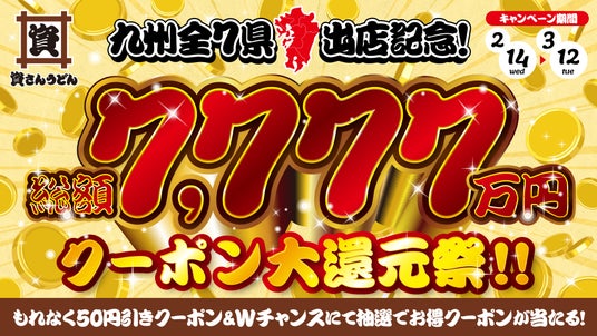 資さんうどん九州全7県出店記念!総額7,777万円のクーポン大還元祭を開催!!!!!