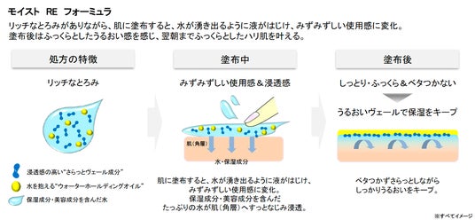 また、生きいきとしたパワフルな印象の美肌を目指すための濃密なテクスチャーで、リッチなとろみがありながら、肌に塗布すると、水が湧き出るように液がはじけ、みずみずしい使用感に変化。塗布後はふっくらとしたうるおい感を感じるモイストRE フォーミュラを採用。
