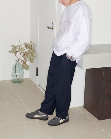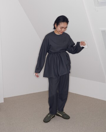 金子綾さんのこだわりが詰まった、エフォートレスなコクーンシルエットのパンツ。