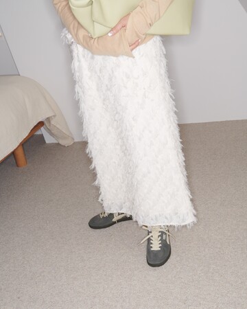 “今年らしいフリンジのビスチェとスカートをセットアップした⽢めのコーディネートに、スニーカーでこなれ感をプラスしてみました。親しみやすい印象になるので、友達とのランチやママ友のお茶会にも最適。スニーカーのシューレースをベージュを変えて、足元のアクセントに”