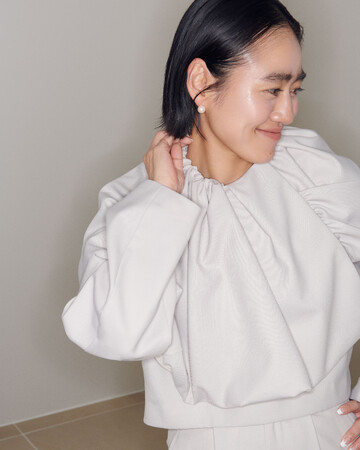 “きちんと感とおしゃれさを兼ね備えたベージュカラーのセットアップは、謝恩会や入学式などのオケージョンシーンにもぴったり。バルーンのようなケープのおかげで、アクセサリーなしでも首まわりが華やかになり、着こなし全体をスタイリッシュに格上げします”