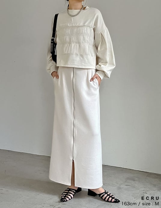 ふんわり広がるシャーリングチュールの透け感が、大人フェミニンな魅力をプラスします。