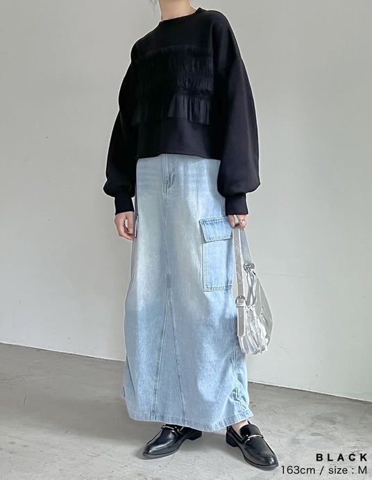 表情豊かなチュールデザインが印象的な裏毛トップス。