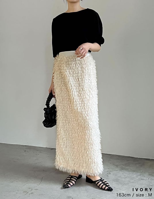 ラメの華やかさと、ふんわりとしたニュアンス感が魅力の大人フェミニンなスカート。