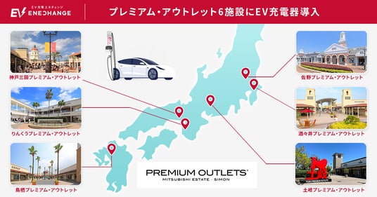 三菱地所・サイモン株式会社が運営するプレミアム・アウトレットは全国10箇所に展開され、非日常的かつ開放的な空間で国内外の人気ブランドのショッピングがお得に楽しめる他、グルメが味わえるとして人気のアウトレットモールです。この度、佐野(栃木県佐野市)、酒々井(千葉県酒々井町)、土岐(岐阜県土岐市)、神戸三田(兵庫県神戸市)、りんくう(大阪府佐野市)、鳥栖(佐賀県鳥栖市)のプレミアム・アウトレットにEV充電エネチェンジの6kW普通充電器2口がそれぞれ設置され、ご利用いただけることになりました。EV充電エネチェンジはEV充電器導入台数No.1(※1)かつ、アプリの利用者数No.1(※2)であり、EVユーザーが多く保有する充電カードが利用できるため、EVで来場する買い物客の利便性が大きく向上します。