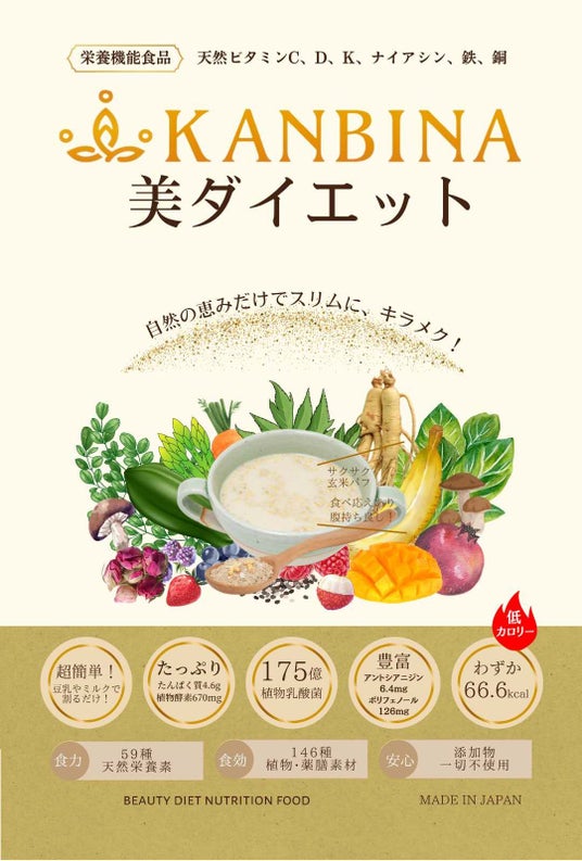 食事制限でダイエットを行う方々にとって、「100%植物由来で添加剤を一切入れてない、栄養バランスは良いけど、カロリーは抑えられている、且つ手軽で便利」そんな理想的な置き換え食があればなと思いまして誕生したのが、KANBINA『美ダイエット』栄養食です。