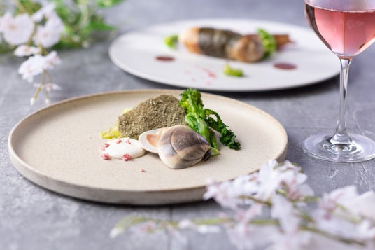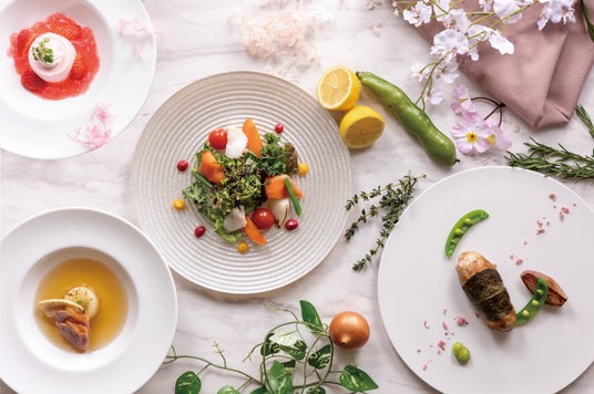 宮城県産『銀鮭』を使用した色とりどりの前菜から、やさしい味わいの山形県産『最上鴨』(合鴨)のコンソメスープ、デザートの桜のパンナコッタまで春を感じられるコース料理です。メインは、三陸産『とろろ昆布』を纏わせた白身魚のムニエルまたは、桜の葉で巻いた岩手県産『岩中豚』のローストよりお好みでお選びいただけます。