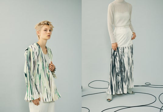 フランスのコンセプチュアルアーティスト(ベルナールベネ)の作品から着想を得て製作した、オリジナルの生地。職人の手作業でランダムプリーツを作成したのち、その上にプリントを施しました。着用して動きが加わることでプリントがのっているところとのっていないところが目立ち、躍動感を感じられます。