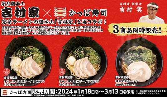1月18日(木)より販売している「本格ラーメンシリーズ」第28弾は、家系ラーメンの元祖として知られる行列必須の名店「家系総本山 吉村家」が監修するラーメン3品を販売しております。かっぱ寿司限定『家系まぜそば』2品と昨年夏よりブラッシュアップした『横浜家系ラーメン』の、コクのあるスープ・オリジナル太麺などで体現した味わいをお楽しみください。