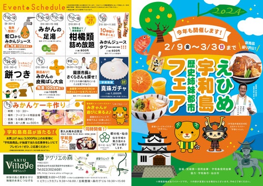 「伊達」を縁とした歴史姉妹都市である愛媛県宇和島市と宮城県仙台市。宇和島市と「姉妹都市交流パートナーシップ協定」を締結しているお茶の井ヶ田株式会社(本社:仙台市)が運営する秋保ヴィレッジで、宇和島の特産品を販売するフェアを開催します。