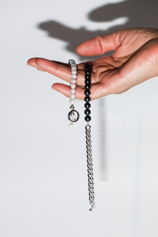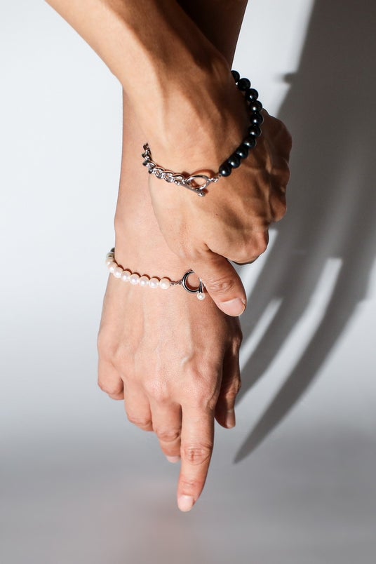 また、あこや黒真珠と太めのマンテルチェーンを組み合わせた、Martine(マルティーヌ)ブレスレットは、パールにエッジスタイルをもたらした先進性で、ジェンダーレスなピースとなっています。