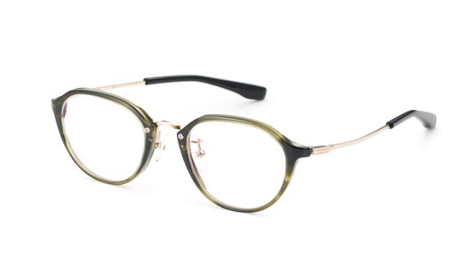 UM-022 カーキササ×ホワイトゴールドUM-022顔なじみが良いフレームシェイプのクラウンパントはソフトで穏やかなフロントデザインです。プラスチックリムとメタルパーツの組み合わせが、見る角度によって豊かな表情を立体的に演出します。