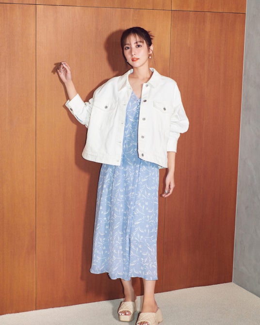 軽やかな楊柳素材に、ドットと羽根を思わせる幾何柄をプリントしたドレス。短め丈のGジャンでクリーンなムードを纏って。
