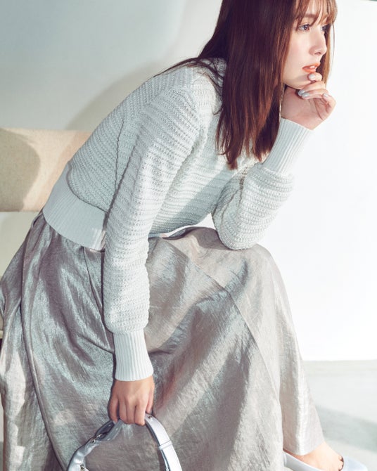 ヴィンテージ感のある光沢素材のタックスカートとラメ素材のテープヤーンニット。どちらも優しい煌めきで、上下で合わせても上品さを保ってくれます。