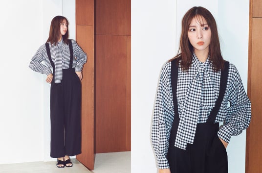 先染めのギンガムチェック素材にふんわりとボリューミーな袖が愛らしいボウタイブラウス。サロペットとモノトーンでまとめればシックなスタイリングに。