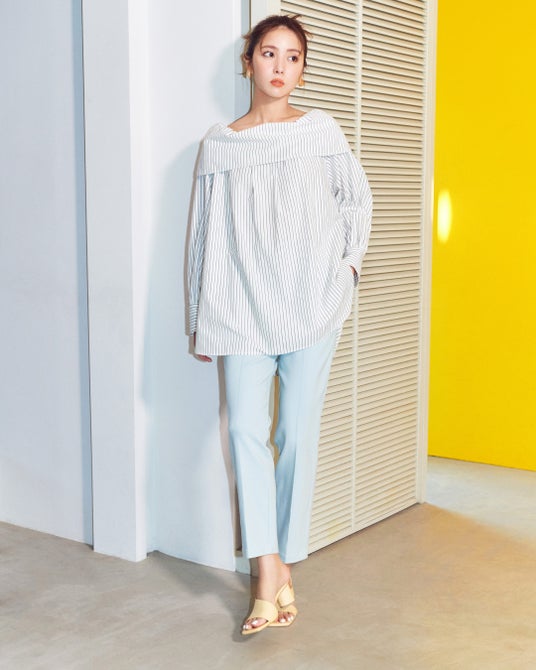 涼やかなミントカラーのテーパードパンツにはイエローのサンダル、旬のオフショルダーディテールを取り入れたストライプチュニックを。フレッシュな色のレイヤードを楽しんで。