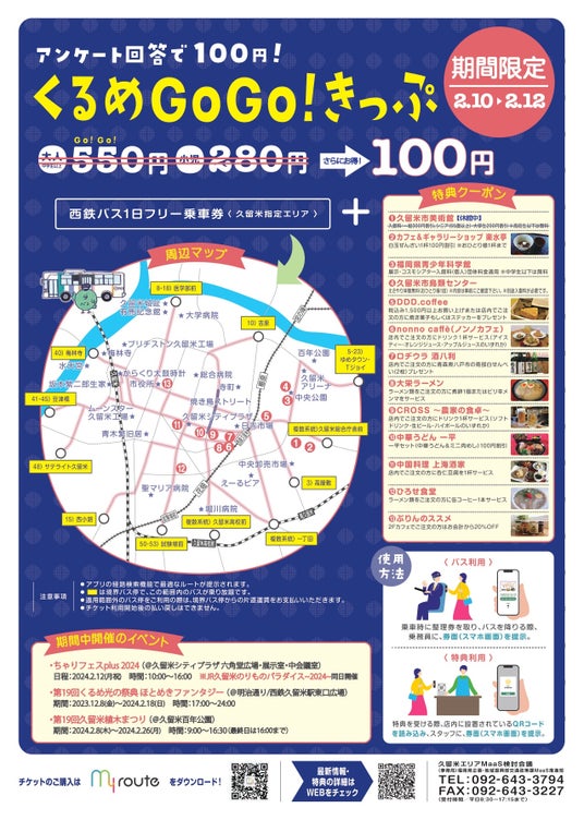 令和6年2月10日(土)~12日(月祝)の期間中、通常550円の「くるめGoGoきっぷ」を100円で購入できるキャンペーンを行います。