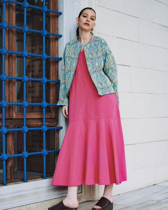 フクレジャカードジャケット ¥63,800 ビスコースリネンワンピース ¥46,200オリエンタルな雰囲気のノーカラージャケットカラフルな柄はキルティングのような立体的なジャカード織で表現されたもの。フランス デュテル社のジャカード素材で、軽くてソフトな風合いも特徴。ショート丈の程よいボリューム感で、軽い着心地が魅力のノーカラージャケット。鮮やかなピンクのワンピースに重ねて。