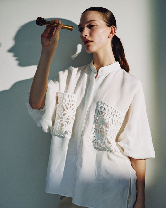 窓枠をイメージしたハンサムシャツ素材はナチュラルさと上品さをあわせ持つドライタッチな着心地の薄手のリネンビスコース。このシャツの魅力は、胸元にある大きなポケット、ボタニカル調のウィンドウフレームをイメージし、シャツと共生地のテープを編み込んでレースのように仕上げたもの。たっぷりとした分量感のドルマンスリーブの袖口をたくし上げて、軽快に着こなすのがおすすめです。