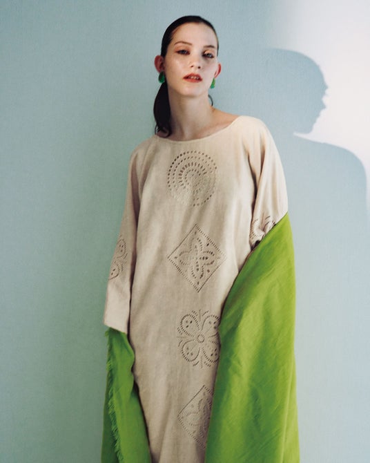 大胆なモザイクモチーフの刺繍が魅力柔らかなコットンリネン素材に、身頃と袖にカットワーク刺繍が施されたワンピース。身頃はすっきりとしたストレートシルエット、袖口と裾のスリットで抜け感のある印象に。前後異なるネックラインで、2WAY仕様のデザインです。