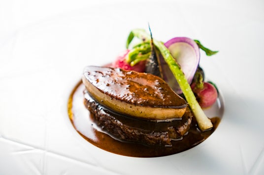 舌平目フォアグラ包み焼き 鶏のジュ ティオペペ シェリー風味 里芋ピューレ添え