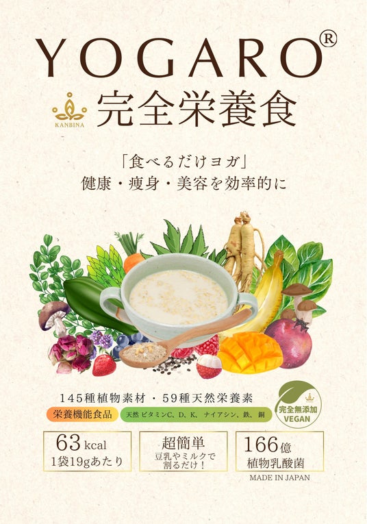 健康維持、瘦身・美容の為に何かしたいが、忙しい生活を送る中で時間が取れないなどの悩みを抱えている方、自分の身体を天然のもので整えたい方、上質で手軽な置き換え食がほしい方々のために、植物性、無添加にこだわり抜いた「YOGARO完全栄養食」が誕生しました。