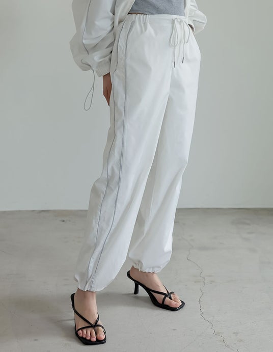裾先にドロストがあり、絞って着こなすとジョガーパンツに。