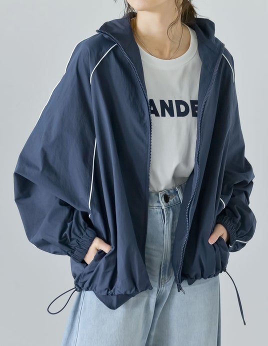 程良いシャカシャカ感と、軽やかでツヤのある素材が魅力のジップパーカー。