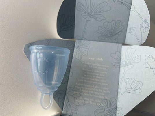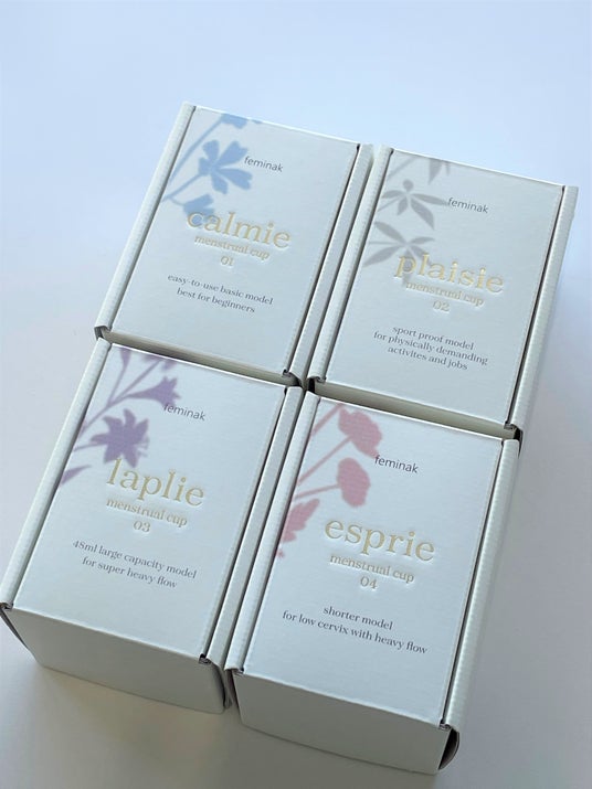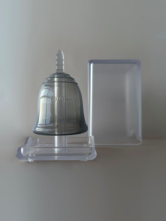 透け感がありつるんとした月経カップに、生理用品にはあまりないナチュラルでシンプルなパッケージ。