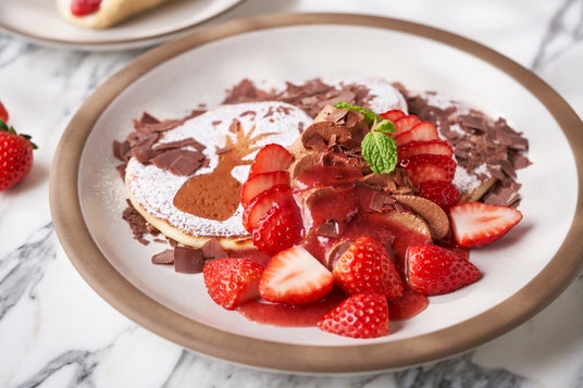 栃木県産の苺「とちあいか」と特製チョコレートクリームを合わせたパンケーキ。