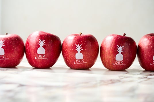 「DEK 青山」のオープン1周年を記念して、当店で飲食をご利用いただいた先着500名様に、DEKのロゴがプリントされた「1周年記念りんご」をプレゼントさせていただきます。