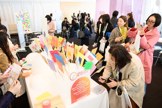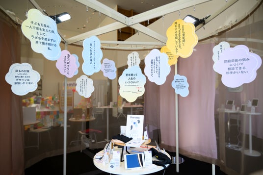 また、ルートの終着点に設けられたワークショップスペースでは、展示で感じたことを実際に言葉や絵、工作などで表現できる企画も。コロナ禍中であった前回の来場者からの「イベントで感じたことをすぐにアウトプットできる機会が欲しい」という声を元に設置しました。「特定の職業でニーズがありそうなフェムテックを考えてみよう」「次世代へ繋げたい願いを書いてみよう」など9つのテーマに沿って、来場者は思い思いに自分の気持ちや考えを表現しました。