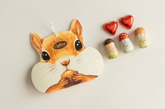 詳細:うるんだ瞳がなんとも愛らしい、リスのビッグフェイス型パッケージ。中にはおとぎ話の中に登場しそうなキノコのホイルチョコレートとキラキラのホログラムが美しいミニハートが5粒アソートされています。